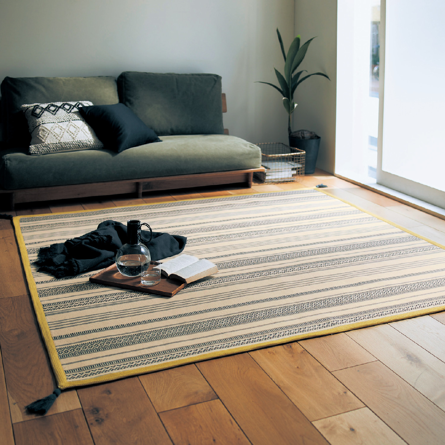 ざっくりとした素朴なインド綿を使用通気性の良い綿素材は、オールシーズン大活躍洗濯機で丸洗いできるからいつでも清潔ウレタン入りの程良い厚み感が素足にも心地いいです四隅のフリンジがアクセントになっています#夏用のラグ・カーペット