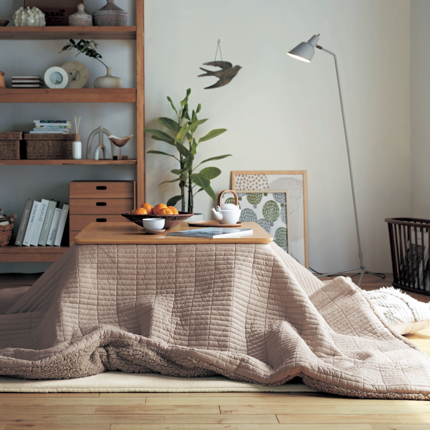 ーデザインー・インテリアにすっきりなじむ人気のイブル風キルトー素材ー・綿素材ならではの柔らかでやさしい風合い・表地は綿素材に洗い加工を施し、表情のある素材感・裏は吸湿発熱ボア素材で肌ざわりぬくぬくー機能ー・ほどよい厚みがありながら、すっきりコンパクトにたためて収納もしやすい・洗濯機で丸洗いできるのもうれしいポイント