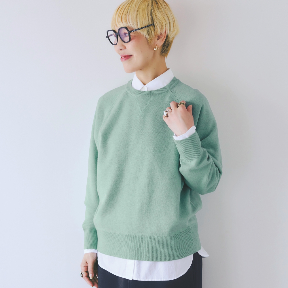 ―デザイン・スタイリング―・襟元にガゼット風の編み地を入れ、 スウェットライクに仕上げたニット・ラグラン部分の編地に柄を入れることで洗練された印象に―素材―・スウェット見えするニット素材・洗濯機で洗える手軽さもうれしい