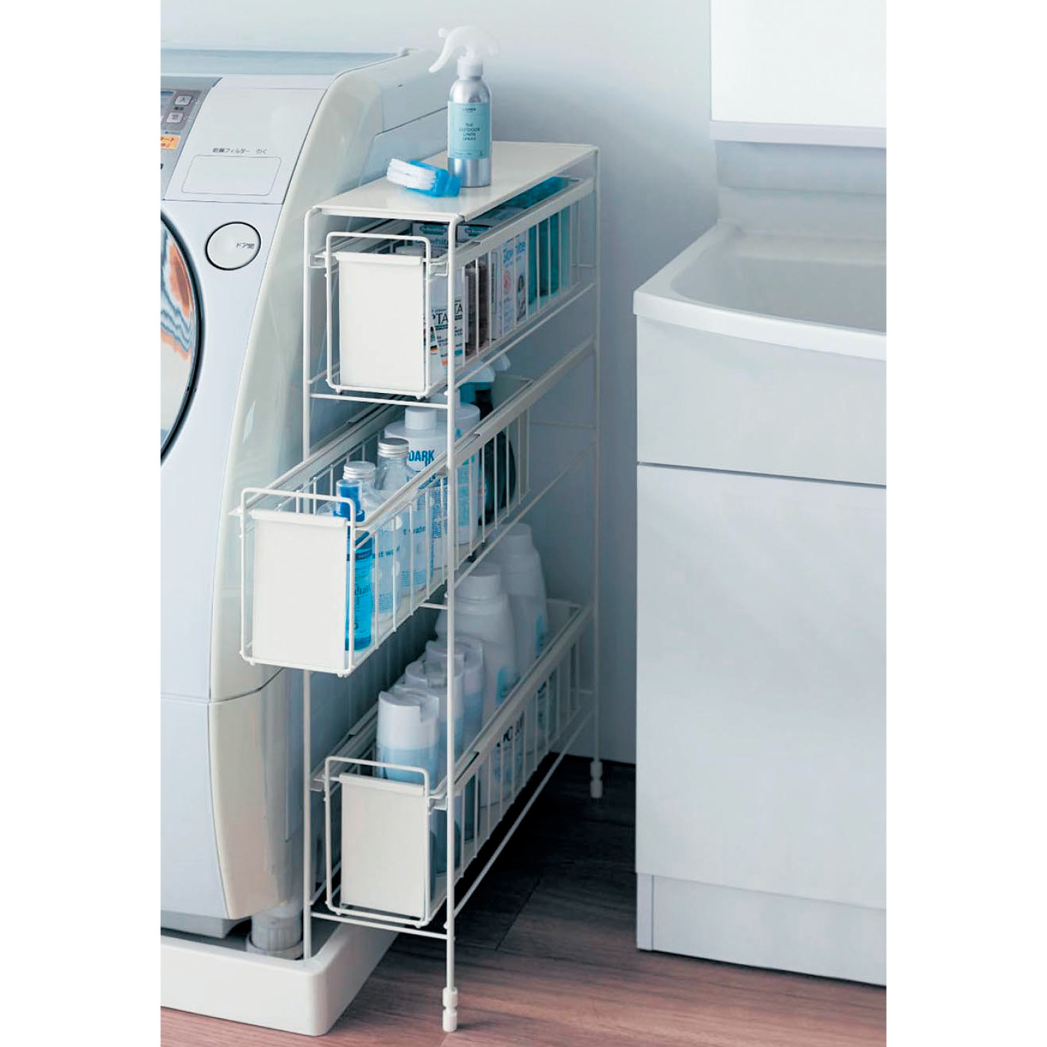 床と段差のある防水パンをまたいで設置できますがたつきを軽減できるアジャスター付き引出しは、スムーズに開閉します引出しにはイヤな音のしない樹脂製コロを内蔵ちょっと置きに便利な天板付き2段タイプ:背の高いボトル類を入れやすい3段タイプ:歯磨き粉や洗剤などがたっぷり入る洗濯機や洗面台と奥行を合わせてムダなく活用