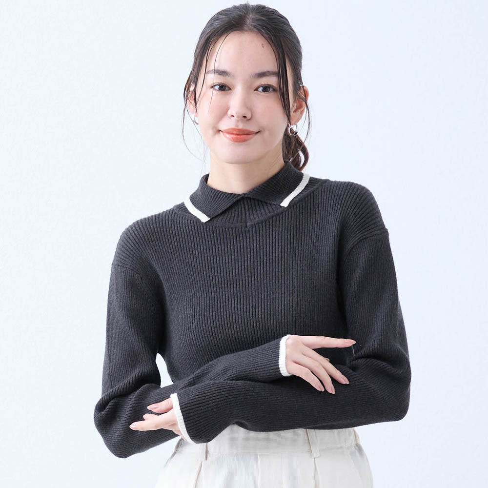 ―デザイン・スタイリング―・体に心地よく沿うリブニット・ポロシャツのような小さな襟がきちんと感のある一着・杢チャコールは襟の白い縁取りもアクセントに―素材―・レーヨン混のなめらかなリブニット・洗濯機で洗える手軽さもうれしい