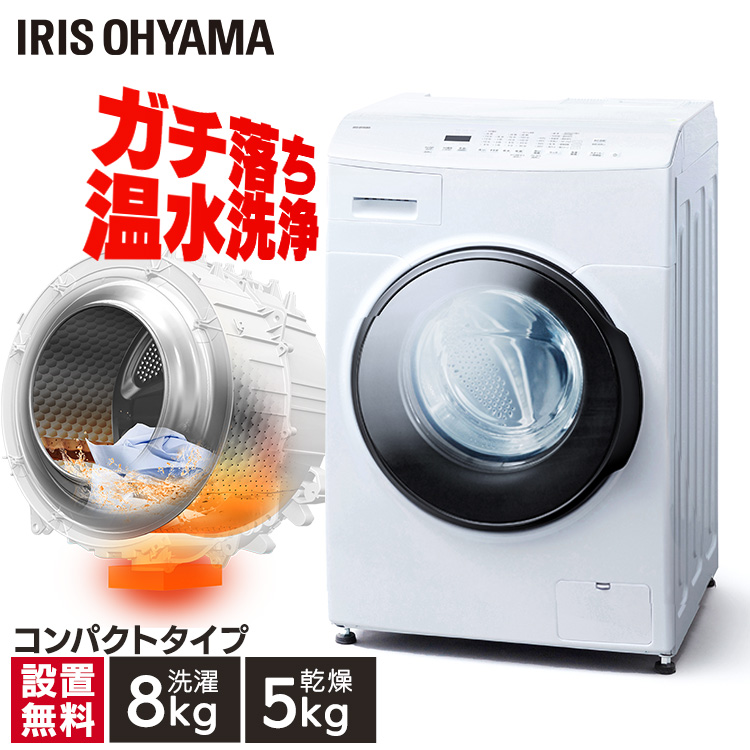 5kgまで乾燥できるドラム式洗濯乾燥機です。【洗濯8kg】【乾燥5kg】【台無】◆アイリスオーヤマ独自の「ファイブセンシング」でしっかり乾燥5つのセンサーを組み合わせた乾燥検知方式を搭載。センサーによる温風温度・庫内温度・吸気温度・衣類量・運転時間の管理で衣類をしっかり乾かします。◆ふんわりシワ取り(80%乾燥)シワのないふんわりした仕上がりを実現します。◆温水洗浄衣類や汚れに合わせた温水で洗い、頑固なニオイや黄ばみを洗浄します。 ◆節水力少ない水でたたき洗いするドラム式。縦型洗濯機より大幅に節水。■定格電圧AC100V■定格周波数50/60HZ■定格入力約1000W■電動機消費電力約200W■温水用電熱装置消費電力約800W■温風用電熱装置消費電力800W■標準洗濯容量8kg■標準脱水容量8kg■標準使用水量80L■標準乾燥容量5kg■標準水量30L■保護等級IPX4■商品サイズ(本体)幅約59.5×奥行約65.2×高さ約90.8■商品質量約72kg
