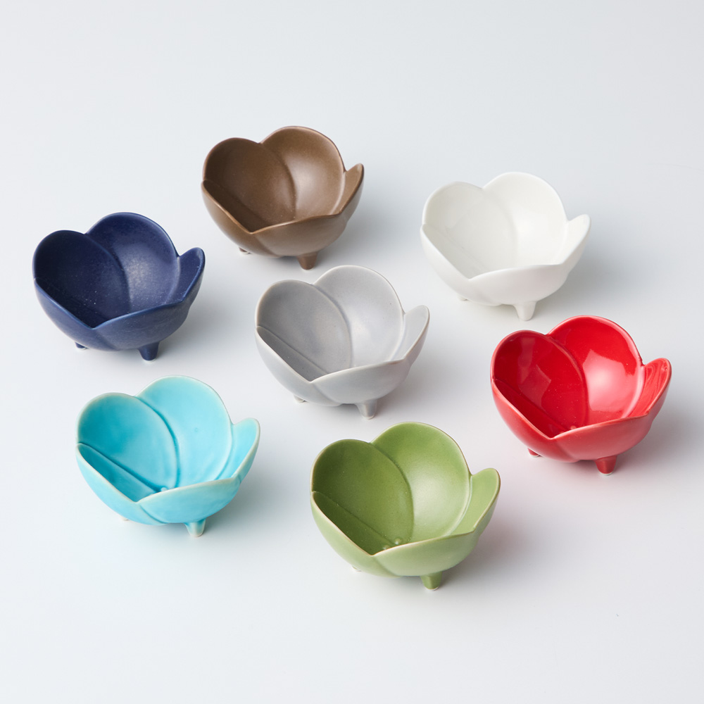ーデザインー5枚の花びら、3つ脚のコロンとした可愛い小鉢和洋を選ばないデザインー素材・機能ーおひたしやお漬物などの副菜・副副菜にクッキーなどのお茶菓子入れとしても陶磁器の一大産地、美濃焼