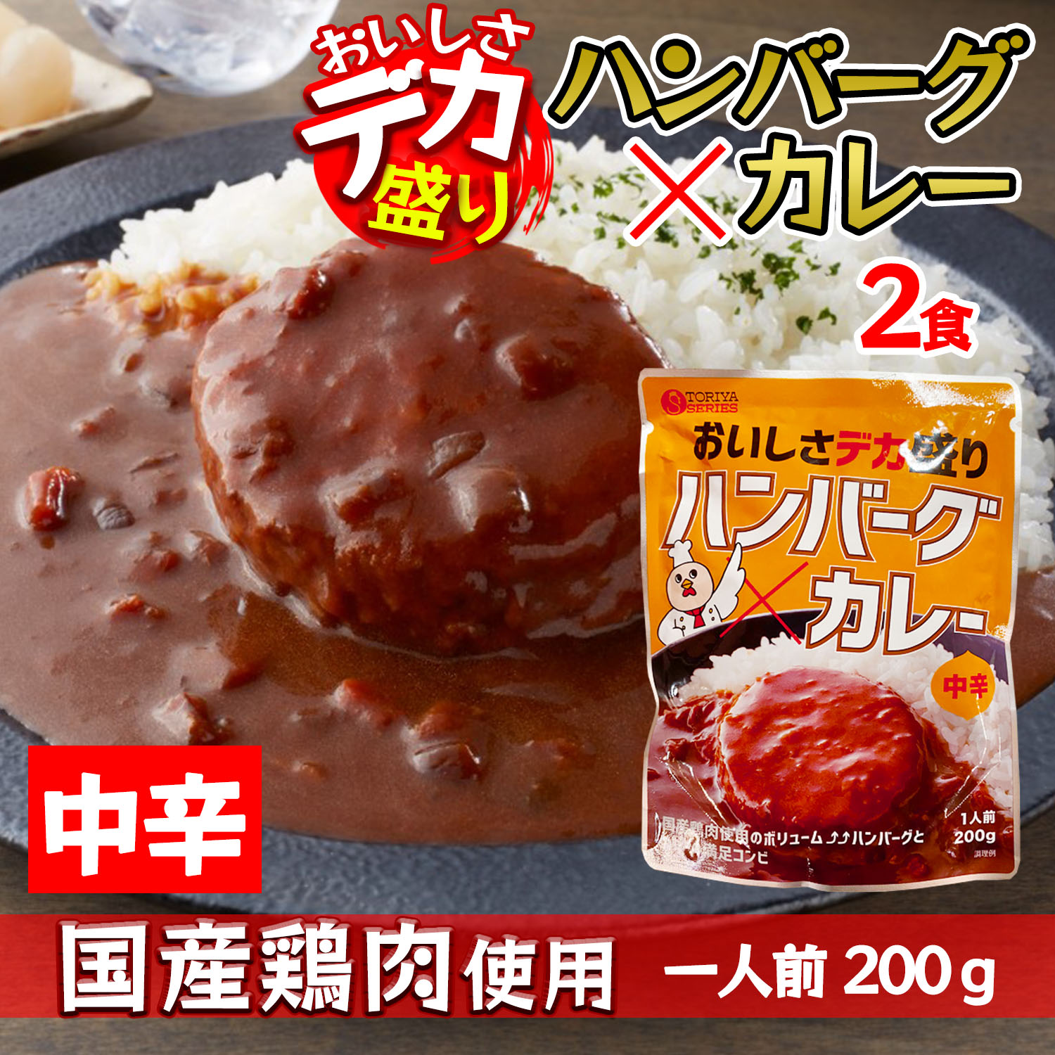 ■デカ盛り ハンバーグカレー レトルトカレー 国産鶏肉 使用 200g 1人前 × 2個セット 中辛 ボリューム満点 電子レンジ 簡単調理