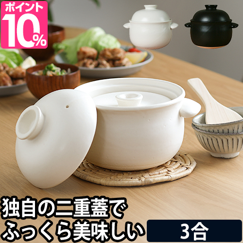 おいしいご飯が簡単に!こだわり二重蓋のごはん鍋■ブランド たいせい窯■サイズ約幅25.5×高さ19.5×奥行き20(cm)■重量約2.52kg■素材 耐熱陶器■容量 3合■対応・ガスコンロ・レンジ・食洗機■付属品 取扱説明書■注意・原材料の土や釉薬の特性により、製品ひとつひとつのサイズ、形状、色、重量に少しの差があります。・加熱中および加熱後は高温の為危険ですので、必ず布巾やミトンなどを使用してください。・加熱した本品を直接テーブルなどに置きますと傷が付いたり変形する恐れがありますので、鍋敷きを必ずご使用ください。・底が濡れた状態で火にかけると故障の原因になりますので水気をよく拭き取ってから火にかけてください。・浸け置き洗いは染みやカビの原因になりますので、ご注意ください。・熱い土鍋を急に冷たいところに置いたり、水に浸けたりしないでください。・においの強い物を入れるとにおいが残る場合がありますのでご注意ください。