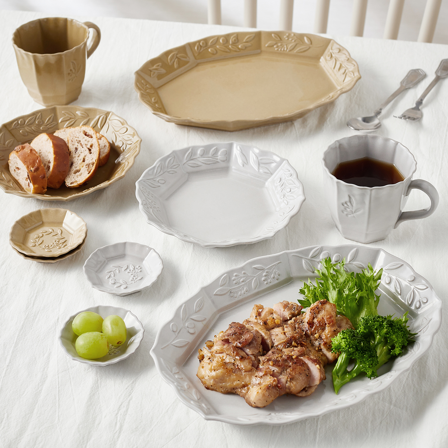 クラシカルなフォルムにオリーヴのレリーフが美しい上品なデザイン日常使いにもうれしいレンジ・食洗機対応いつものおもてなしの一皿のグレードを格段に上げてくれるでしょう。フチが立ち上がっているので、中央に盛ったお料理を華やかに引き立ててくれますサイズ違い・色違いを重ねてコーディネートするのもおすすめです[オーバル]約26cmプレートやメイン料理のお皿としてご使用いただけます楕円形のリム皿は、定番のパスタやカレー料理をよりおしゃれに演出。オードブル皿にもおすすめ。[プレートМ]径約16.7cm八角のリム皿は、ケーキやパン皿などに小さすぎず大きすぎず何かと使い勝手のいいサイズ感[プレートS]径約9cm八角のリム皿お醤油皿や薬味受け、またお茶菓子やクッキー皿などにご使用いただけますコーヒーに合わせるチョコレートや、ワインのおつまみとして、ナッツやオリーヴの実などの盛り付けにも[マグカップ]容量約300ml側面と底面にオリーヴの刻印が入ったデザイン