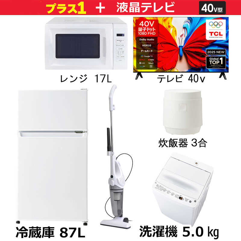■新生活家電セット5点 ホワイト 白 【プラス 40V型液晶テレビ付】 冷蔵庫 / 洗濯機 / 液晶テレビ / 電子レンジ / 掃除機 / 炊飯器[一