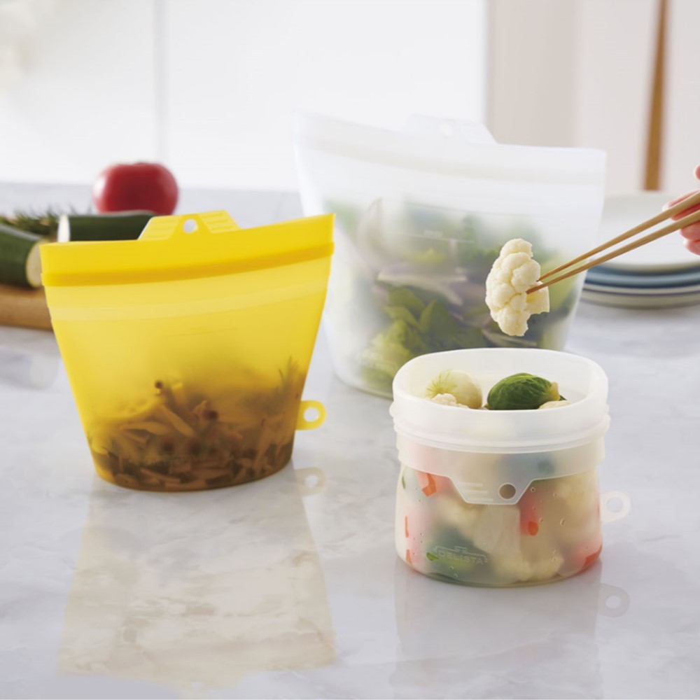 ラップやポリ袋を使わずに食材を保存できる、シリコーンゴム製のバッグ繰り返し洗って使えるので、ゴミの量を減らせてサスティナブル冷凍冷蔵はもちろん、電子レンジや湯煎、食洗機もOK口を大きく開けて自立もするので食材が入れやすい底が広いので肉や野菜を積み重ねて作るような調理にも活躍柔らかいのでバッグごと揉んで下味をつけることもできます上部に湯煎時に箸でさっと取り出せる穴付き下部の横には吊るして乾かすのに便利なループ付き