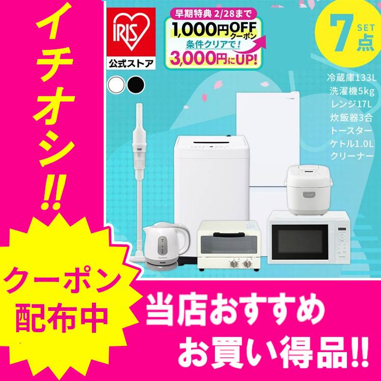 ■\2000円OFFクーポン!~2/12 9:59/家電セット 一人暮らし 7点 アイリスオーヤマ 冷蔵庫 133L 洗濯機 5kg 電子レンジ 掃除機 炊飯器 電気