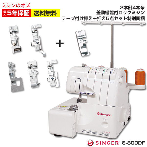 メーカー:シンガー型式:S-800DFシンガー製の差動機能付き2本針4本糸ロックミシンいまなら、あると嬉しい押え5点セットが特別同梱!■ミシン機能:差動送り、カラーガイド、カンタン下ルーパー糸掛け、送り目調節ダイヤル、かがり幅調整ダイヤル、上メス解放レバー、セーフティストップ機構、フリーアーム、巻きロック切り換えレバー、LEDライト■標準付属品:ミシンカバー、糸コマネット×4個、ミシン油、ブラシ、六角レンチ、針セット(HA×1 #12 2本、#14 2本)、付属品ボックス、糸コマキャップ×4個、ピンセット、ドライバー、テープ付け押え、フットコントローラー(電源コード兼用)