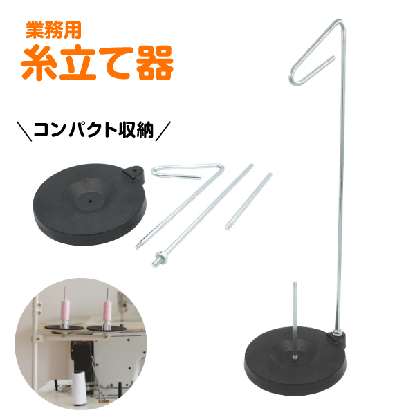 ご家庭のミシンで工業用・業務用ミシン糸が使える!業務用糸立て器です。設置は簡単!土台に重さがあり、安定感抜群!大容量のミシン糸が家庭用ミシンで使用できるのは経済的♪勿論、お使いの家庭用ミシン糸セットにも ご利用いただけます。組立式なので、使わない時はコンパクトに収納できます。【組立方法】1.長い棒2本を繋げて1本にする2.繋げた棒を土台の横の穴に挿してねじ込む3.短い棒を真ん中の穴に挿してねじ込んだら完成