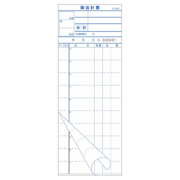 ■【全国送料無料】会計伝票 御会計票 S-20AL 2枚複写・ミシン10本 番号入 No.1〜5000 50組×100冊【取り寄せ商品・即納不可】
