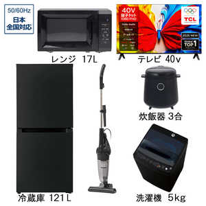 ■新生活家電セット 5点 ブラック 黒 【+ 40V型液晶テレビ 】 冷蔵庫121L / 洗濯機5kg / 量子ドット液晶テレビ / 電子レンジ / 掃除機 / 炊飯器 [ 一人暮らし 家