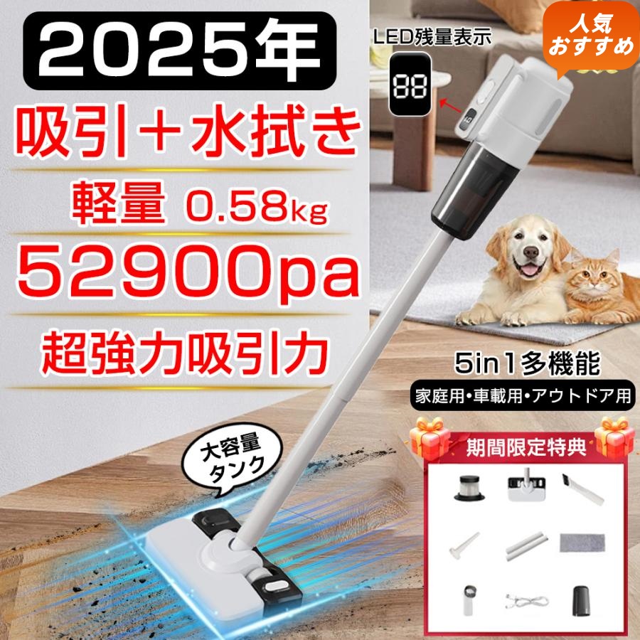 掃除機 コードレス 軽量 52900pa吸引力 強力吸引 吸引水拭き一体 サイクロン 自立 自走式 USB-Type C充電式 大容量タンク 省エネ 静音 車両用 2025最新 人気 爆買