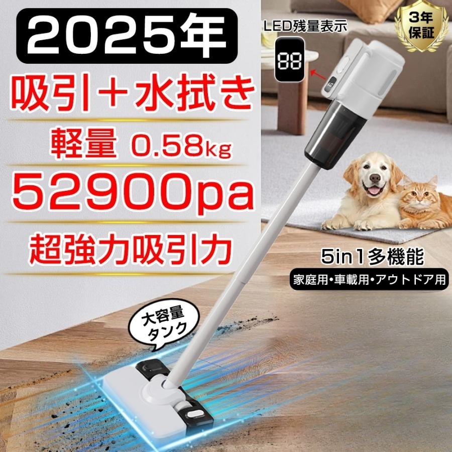 ■掃除機 コードレス 軽量 52900pa吸引力 強力吸引 吸引水拭き一体 サイクロン 自立 自走式 USB-TypeC充電式 大容量タンク 省エネ 静音 車