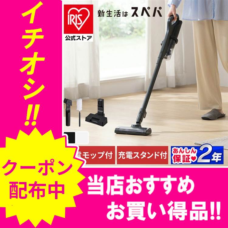 ●商品サイズ(cm)フロアヘッド・延長パイプ含む:幅約25.9×奥行約27.5×高さ約98.0充電スタンド設置時(アタッチメント含まず):幅約27.5×奥行約28.8×高さ約104.1●製品質量本体のみ:約1.3kgフロアヘッド・延長パイプ・バッテリー含む:約1.9kg●集じん容積ごみすてラインまで:0.2L/最大容積:0.3L●充電温度5〜35℃●連続使用時間※1ターボ:約9分標準:約17分自動:約35分(使用状態により異なります)ちりとり:約120分(使用状態により異なります)●バッテリー/容量/寿命リチウムイオン2次電池/2500m Ah/繰り返し充電約1000回●定格電圧DC22.2V●充電電源(充電アダプター)入力:AC100V-240V、50/60Hz出力:DC26.4V、0.9A●充電時間約4時間●付属品充電アダプター、充電スタンド、静電モップ、モップ帯電ケース、すき間ノズル、ブラシノズル、クリーニングブラシ●消耗品(別売り)バッテリー:CBL21625排気フィルター:CFT79静電モップ:CHM03-W※1 満充電、バッテリー初期温度:20℃(アイリスオーヤマ)