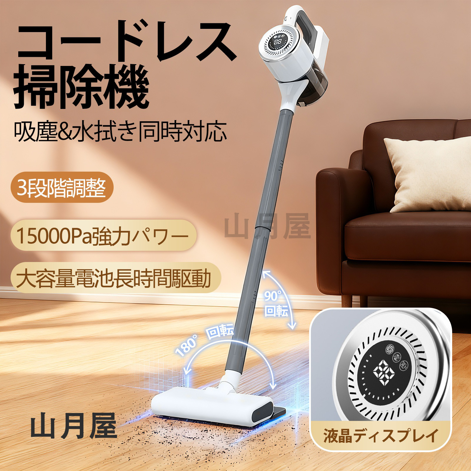仕様 連続使用時間: 約30分(標準モード) 重量: 1.5kg ダストカップ容量: 880ml 充電方式: Type-C 急速充電 付属品: 延長パイプ、フロアノズル、モップ、各種ノズル、取扱説明書等 特徴 ダブルクリーニング 前部で吸塵、後部で水拭きが可能。一度の動作で2段階の清掃を実現します。 長時間駆動 & 急速充電 内蔵2000m Ahリチウム電池で最大30分連続使用可能。Type-C対応で充電も便利です。 軽量・操作性抜群 本体重量はわずか1.5kg。片手でも楽に操作でき、フロアノズルは270°回転で狭い場所も楽々掃除できます。 高度なフィルターシステム 円錐形サイクロン、HEPAフィルター、排気口フィルターなど5段階の精密フィルタリングにより、二次汚染を防止します。 衛生的なゴミ捨て ワンタッチでダストカップ(880ml)を開封でき、手を汚さずゴミを排出できます。 マルチ電源対応 & 安全設計 モバイルバッテリー、車載充電、PC接続など多彩な充電方法に対応。5段階のバッテリー保護機能も搭載。