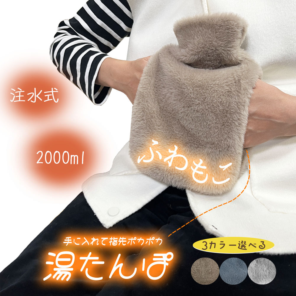 ■湯たんぽ ゆたんぽ エコ湯タンポ 容量2000ml 3カラー選べる お湯入れ 注水式 カバー付き シリコン 可愛い 柔らか もふもふ 保温カバー付