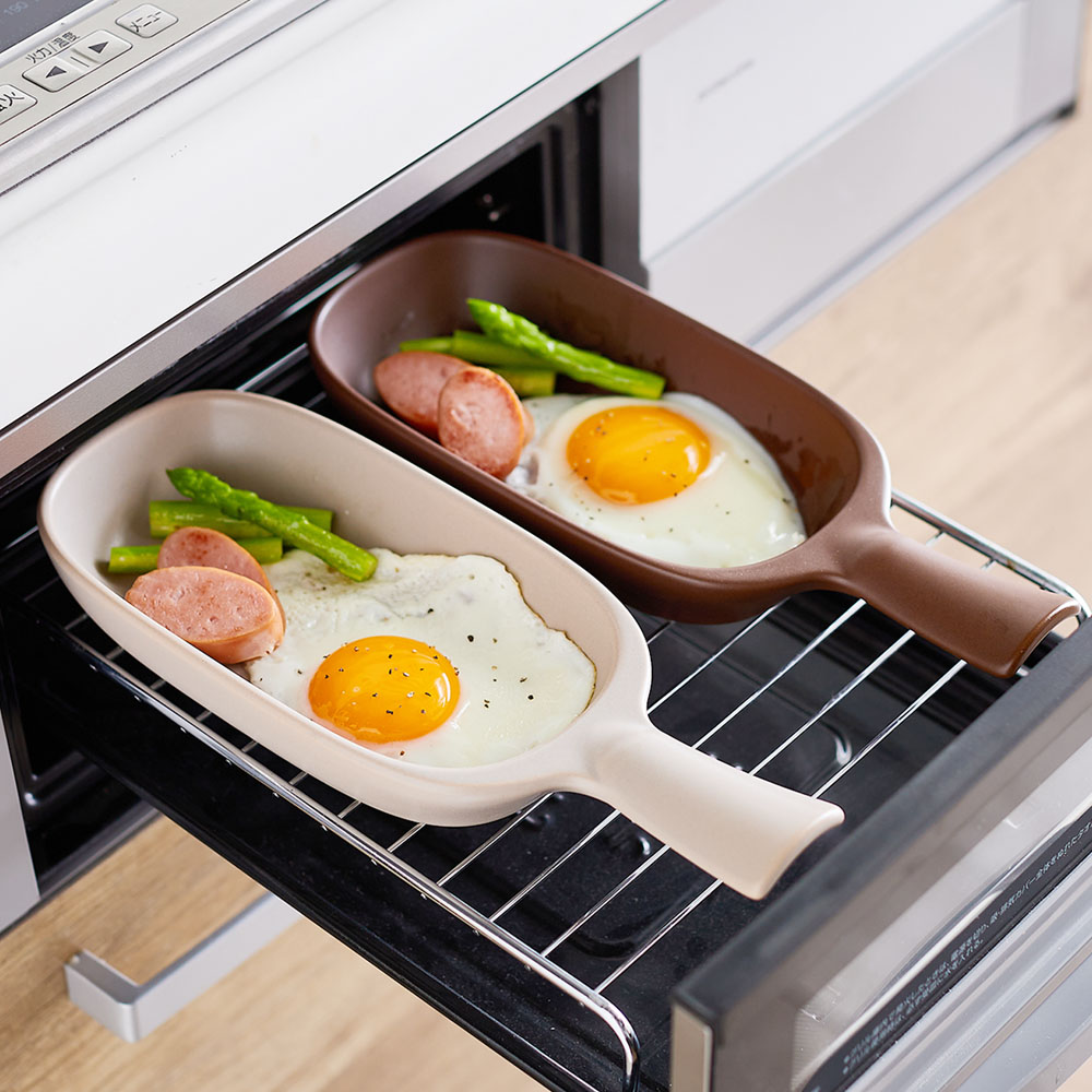 コンロの魚焼きグリル、「後片付けが大変だから・・・」という理由で、眠らせていませんか?実は、魚焼きグリルは焼き魚以外にも色々できる、便利な調理器具なんです。予熱にも時間がかからず、オーブンには出せない高温でこんがりジューシーな仕上がり。グリルディッシュハンディは、そんな魚焼きグリルでの調理をお手伝いしてくれる耐熱皿です。魚焼きグリルはとっても高火力。オーブンには出せない高温ですばやく食材を包み込み、短時間で調理魚焼きグリルは予熱にかかる時間が短いのが特徴。オーブンと比べて、予熱も調理も短時間!グリルを汚しにくいから、グリル調理が手軽に魚焼きグリルに2つ並べて入るサイズ設計調理してそのまま食卓まで運びやすいハンドル付き別でお皿を用意しなくても良いので洗い物削減にも。コンロでお料理しながら、グリルでもう一品同時に作れる忙しい朝ごはん作りにも活躍してくれます