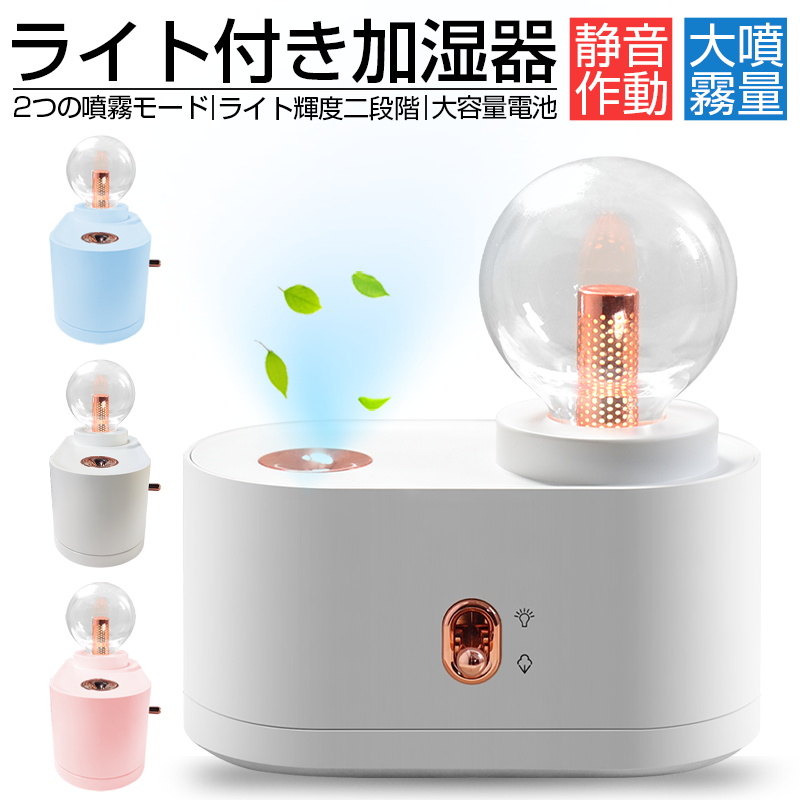 【超音波式】超音波加湿器は高周波数振動で水を微細なミストに分解して放出し、超微細ミストの潤いをお届けします。きめ細かいミストで吸収しやすく、肌への水分補給に最適で、乾燥対策として最適です。また霧化する時大量のマイナスイオンは放射するので、静電気の発生も防げます。【2つの噴霧モード】スイッチを下向きに押し、4時間タイマーの持続噴霧モードで作動します;下向きに二回押すと8時間タイマーの断続噴霧モードに切替えます;もう一回押すと噴霧を停止できます。室内の湿度によって適切なモードで加湿できます。【二段階輝度調節】スイッチを上向きに3秒間長押し、電源とともにナイトライトが起動します(デフォルト初期輝度は50%)。二回押すと輝度は100%に上がります。もう一回押すとナイトライトを消灯します。気分によって自由に調節でき、優しい雰囲気を作ります。【カラー】ブルー、ピンク、ホワイト
