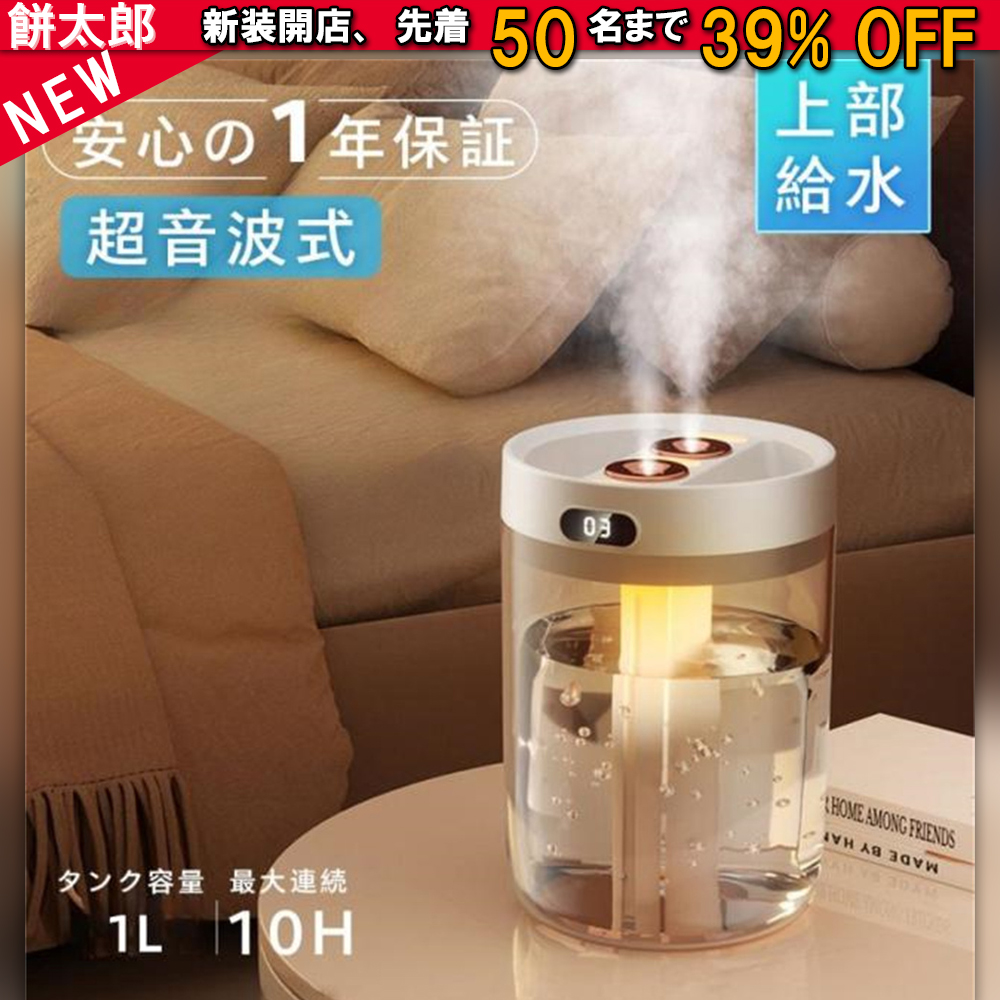 加湿器 アロマ加湿器 小型 コンパクト 超音波式 卓上 最大10時間 アロマオイル 1.0L大容量 上から給水 静音 連続運転 空焚き防止 洗いやすい 手入れ アロマ対応