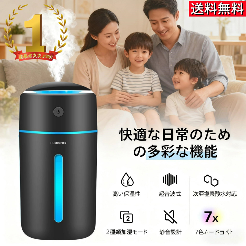 ●LEDライト付き加湿器!●カラフルに光る!コンパクトなミニ加湿器でオフィスなどの机の上や車の中にも置けます。日々の疲れも乾燥もこの1台で【カラフルなライト】グラデーションで変わるモードに加えて、自分の好きな色に設定できるモード、光らせず加湿だけを楽しむモードとシーンに合わせて変更が可能です。【アロマウォーター】上部を外し水を張ったタンクに市販のアロマウォーターを加えると、加湿に加えて香りまで楽しめます。※オイル類は使用しないでください。【可動域】加湿器の角度を変えることができます。直接顔の方に向けることができます。※垂直にはなりません。