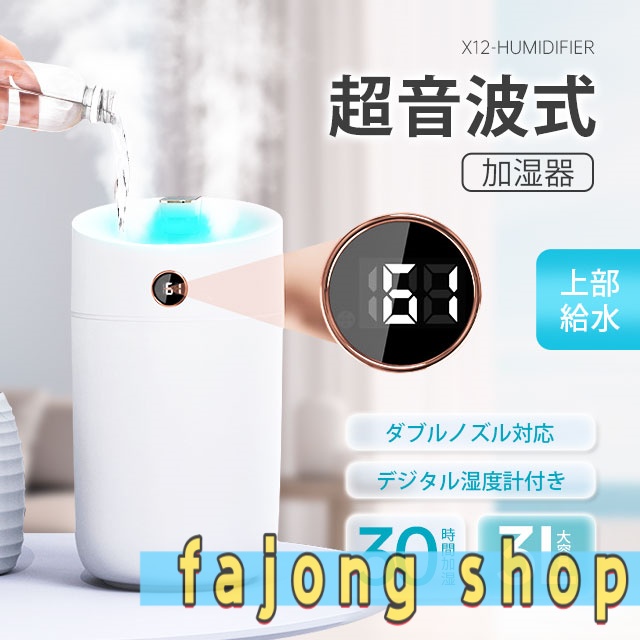 商品詳細: 【キーワード】 【商品??】加湿器 大容量 超音波式 卓上 3L スチーム式加湿器 自動停止機能 静音 おしゃれ 省エネ 節電 エコ 湿度表示 長時間加湿 乾燥対策 室内 ・商品名:加湿器 ・カラー:ホワイト/ピンク/グリーン ・重量:400g 【商品説明】 ◎ダブルミスト噴射口、効率的に加湿できる 2つのミスト噴霧口が細かいミストで素早くお部屋をうるおす、水が積もることがない超音波方式を採用しています。 ◎シンプルな3段階加湿モード 連続運転と、5秒ごとにON/OFFを繰り返す間欠運転機能があり、抑えめに加湿する際などに便利です。 ◎リアルタイムの湿度確認 湿度を検知するセンサーを搭載しており、お部屋の湿度が一目で分かります。 ◎3L大容量で一晩中ずっと潤う 1回の満タン給水で長時間加湿器できるから、たびたび給水の必要がありません。 ◎LEDライト付きで癒し空間に LEDランプも搭載しているので幻想的な雰囲気を楽しみたい時はライトON。