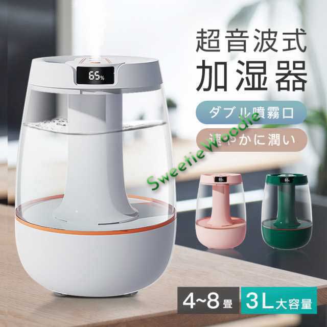 ■超音波式 加湿器 超音波加湿器 3L 大容量 冬の乾燥対策 LEDライト付き ダブル噴霧口 自動湿度コントロール USB充電式 オフタイマー 加湿