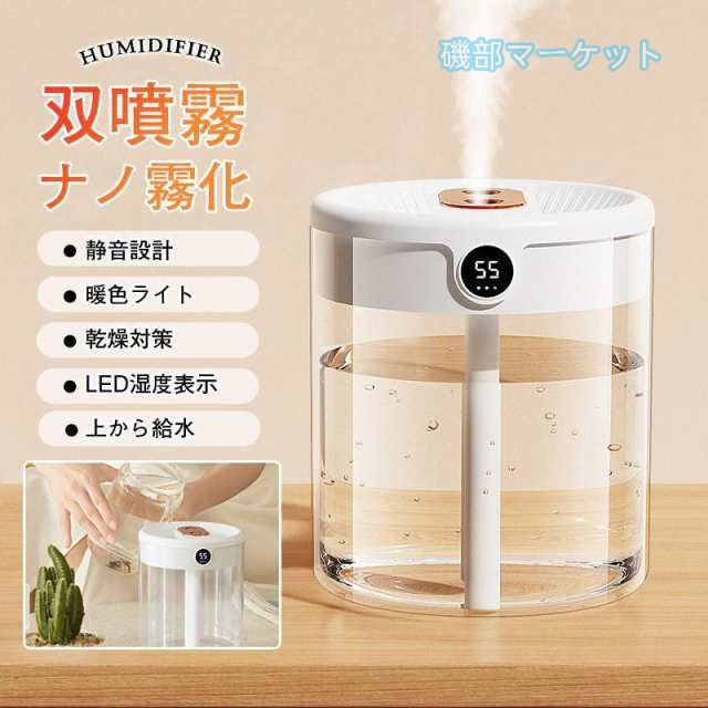5L 加湿器 ダブル噴霧 ダブルノズル 湿度表示 室温検測 卓上 超音波式 5L 大容量 デジタル表示 ミスト量3段階調整 シルバー抗菌 湿度管理 省エネ 静音 除菌 空気浄化 次亜塩素酸水対応 空焚き防止 乾燥対策