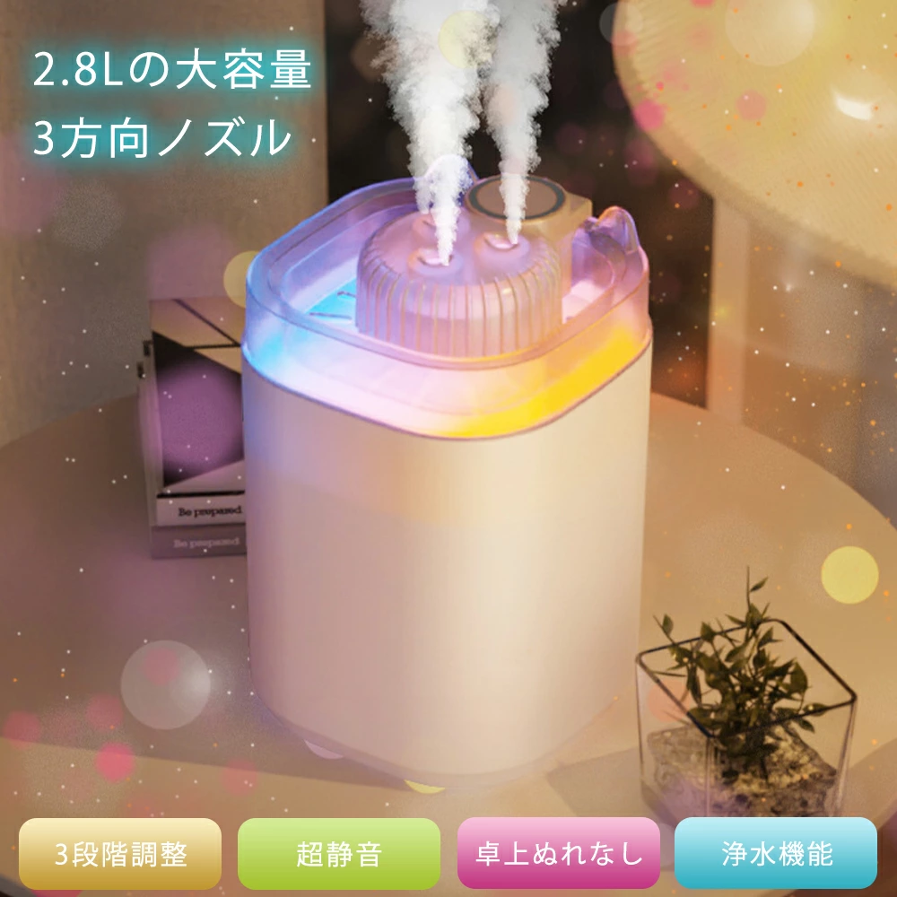 ■加湿器 3連ノズル 2.8L 7色LEDライト 小型 加湿機 超静音 コンパクト加湿器 軽量 空気清浄 お手入れ簡単 卓上 おしゃれ オフィス 大容量