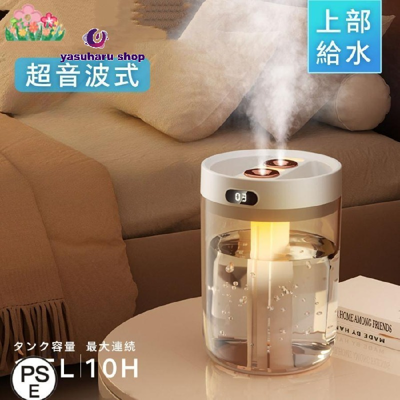 【ダブルノズル卓上加湿器】超音波式加湿器は超音波で水をミストにして拡散して、部屋を加湿します。コンパクトですが、280mlの大容量タンクがあって最大約8時間使用できます。乾燥時期の対策としておすすめします。ルームを加湿して室内の快適な湿度を保ち、お肌や喉の乾燥を防げて病気も予防できます。 【静音設計】アロマディフューザーの動作音は約25d Bで、ささやき声より静かです。リビングに置いて仕事も睡眠も全然邪魔しません。便利な空焚き防止機能も備えて、水がなくなると自動停止します。眠る時にも安心して利用できます。 【2種類噴霧モード】 電源ボタンで持続噴霧モード1回押し間隔噴霧モード2度押し(3秒動作して、3秒休む)が選べます。 【ナイトランプ機能付き】 3秒長押しして、ライトボタンを押すと2色ナイトランプ起動します。