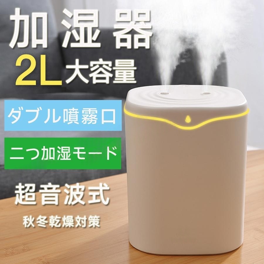■レビュー特典 加湿器 小型 卓上 ダブルノズルポータブル 超音波加湿器 2000ml大容量 LEDライト 空焚き防止 静音 2種類加湿モード 噴霧式