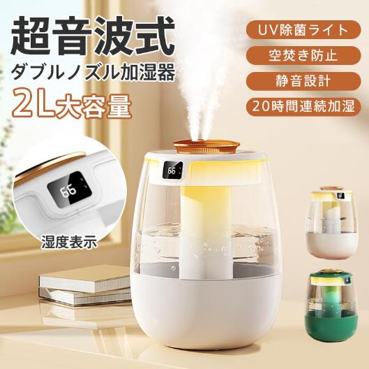 商品詳細: 【キーワード】 【商品??】加湿器 大容量 超音波式 卓上 3L スチーム式加湿器 自動停止機能 静音 おしゃれ 省エネ 節電 エコ 湿度表示 長時間加湿 乾燥対策 室内 ・商品名:加湿器 ・カラー:ホワイト/ピンク/グリーン ・重量:400g 【商品説明】 ◎ダブルミスト噴射口、効率的に加湿できる 2つのミスト噴霧口が細かいミストで素早くお部屋をうるおす、水が積もることがない超音波方式を採用しています。 ◎シンプルな3段階加湿モード 連続運転と、5秒ごとにON/OFFを繰り返す間欠運転機能があり、抑えめに加湿する際などに便利です。 ◎リアルタイムの湿度確認 湿度を検知するセンサーを搭載しており、お部屋の湿度が一目で分かります。 ◎3L大容量で一晩中ずっと潤う 1回の満タン給水で長時間加湿器できるから、たびたび給水の必要がありません。 ◎LEDライト付きで癒し空間に LEDランプも搭載しているので幻想的な雰囲気を楽しみたい時はライトON。