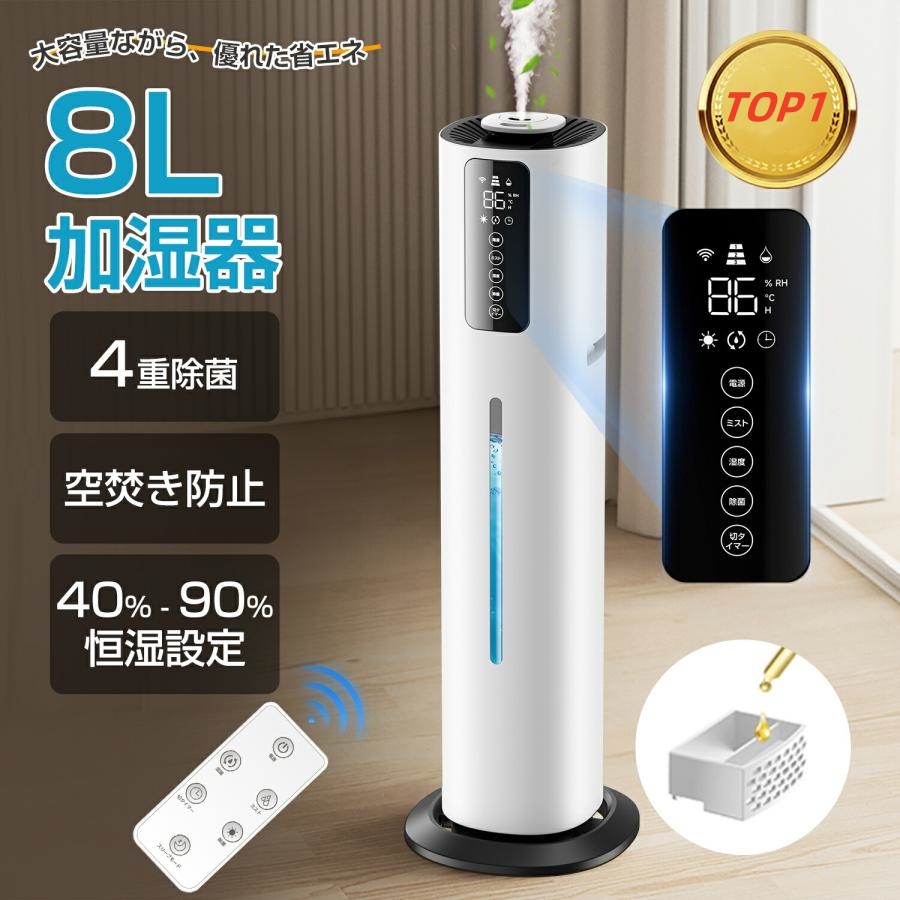 ■加湿器 タワー型 9L大容量 ハイブリッド 4重除菌 UV除菌 ヒーター機能 高温除菌 アニオン 6段階加湿量調節 タイマー付き アロマ対応 空焚