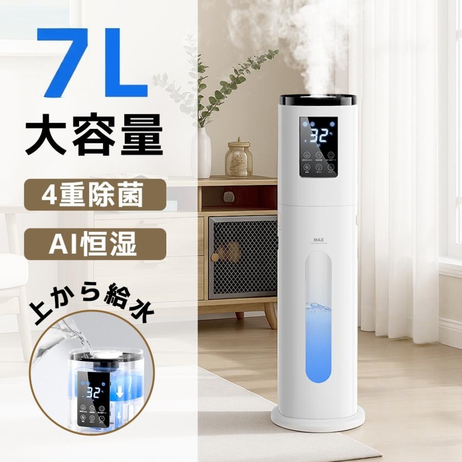 ■加湿器 大容量 7L 超音波式 自動湿度調節 タワー式 花粉対策 四重除菌 空気浄化機 UVライト付き 除菌 空焚き防止 リモコン付き タイマー