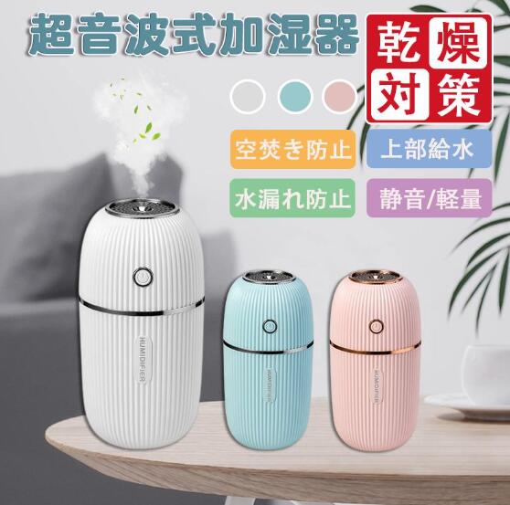 加湿器 卓上 車用加湿器 超音波式 USB充電式 300ml大容量 最大10時間連続加湿 7色LEDライト 空焚き防止 オフィス 部屋 車載 乾燥/花粉症対策