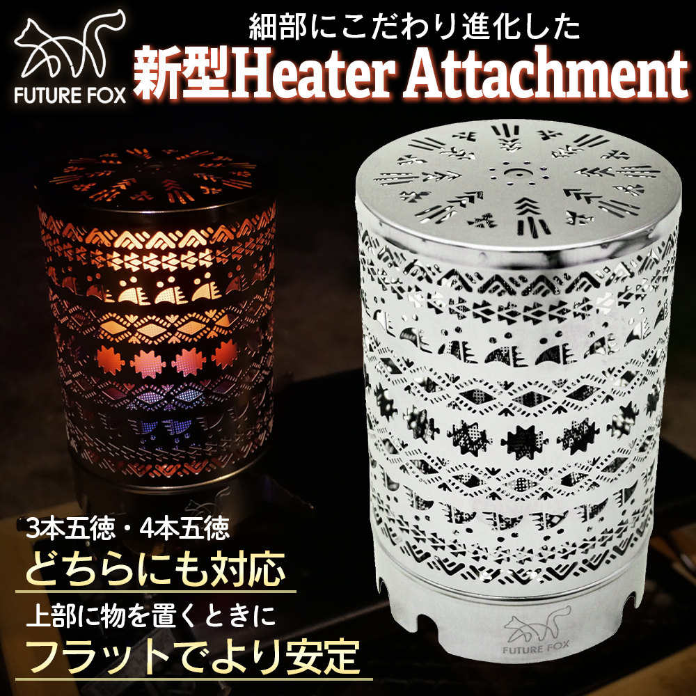 FUTURE FOX ヒーターアタッチメント 既存のヒーターアタッチメントにファンの皆様からのご要望を付け加えて改良した一品です。 ヒーターアタッチメントの魅力 シングルバーナーでヒーターアタッチメントを熱することで遠赤外線が放射され暖房器具になります。遠赤外線ストーブは効率よく暖かさを空間に伝えてくれるので、寒いテント内でも暖かく快適に過ごすことができます。 前モデルと変わったこと 1.3本五徳のバーナーに対応 既存のモデルと一番の変更点は3本五徳のシングルバーナーにも対応している点です。 2.全ての面をナバホ柄に 最大の特徴で、今回は全面を細かなナバホ柄にしました 。暖をとるだけでなく、内部が赤く染まっている様子をナバホ柄を通して鑑賞することができます。 3.上面を平らにしクッカーが安定 上面を平らにしたことで、ヒーターアタッチメントの上にクッカーを乗せた場合でも安定します。 ヒーターアタッチメントは二重構造となります。内部はステンレスをメッシュ加工しています。メッシュ加工をしていることで、炎を熱に変換させ遠赤外線を放射します。