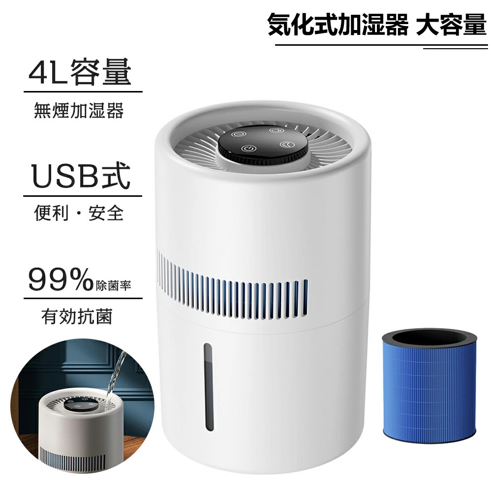 加湿器 気化式加湿器 大容量 4L 最大20畳対応 空気清浄 多重除菌 上部給水 加湿機 お手入れ 簡単 乾燥対策 ウイルス対策 超静音 省エネ 節電 子供部屋 ひとり暮らし 車載 学校 寝室 家庭用 おしゃれ