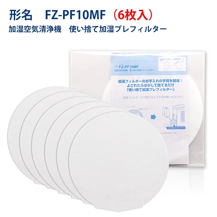 シャープ加湿空気清浄機と互換性ある 使い捨て加湿プレフィルター FZ-PF10MF 6枚入り 互換品 ※純正品ではございません。(同等にご使用いただけますのでご安心ください。) お手入れのしかた お手入れが簡単で、加湿フィルターの表面にのせってお使いください。 手順 1、加湿フィルターのフィルターわく(グレー)をはずす 2、使い捨て加湿プレフィルターを加湿フィルターにのせる 3、フィルターわく(グレー)を元通り取り付ける 4、加湿フィルターをトレーにセットし、トレーとタンクを本体へ取り付ける