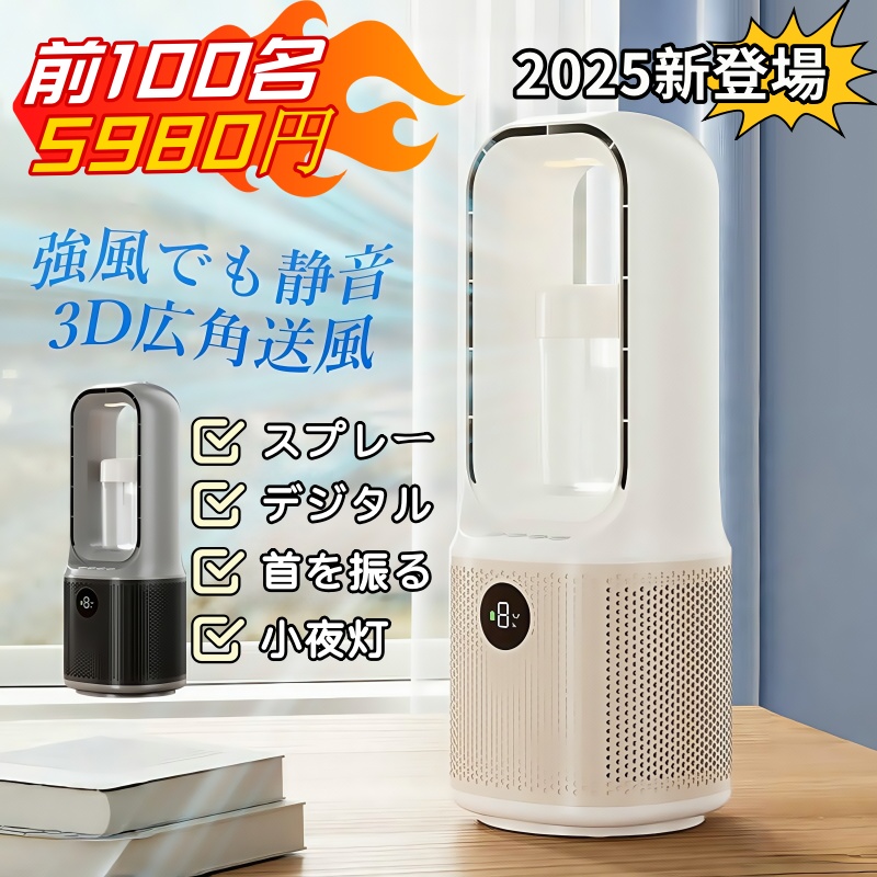 ■クーポンで1点5,980円【9段風量×加湿】扇風機 羽なし扇風機 USB充電式 卓上 熱中症対策 大風量 パワフル 自然風 省エネ コンパクト 寝室