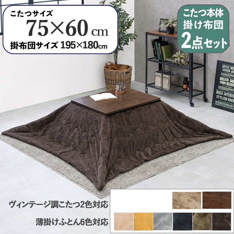 ■【2点セット】こたつ+薄掛けこたつふとんセット 無地柄 ブラウン 全6色 長方形 ダークブラウン テーブル 75×60cm 古木調シート 継脚