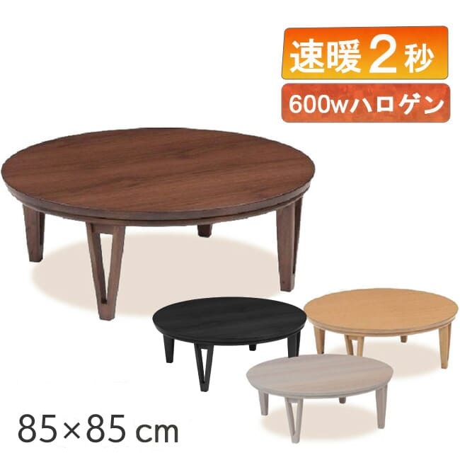 【サイズ】 85サイズ: W85(直径) ×H38/cm ■素材:天板:オーク材突板 / ウォールナット突板 脚部:ラバーウッド無垢 ■重量:天板/6.0kg、本体/17.2kg ■機能: ◇600Wハロゲンヒーター・手元コントローラー ◇傷の付きにくいUVハード塗装 ◇脚の取り付け角度を90度変えられますので、雰囲気が変わります。 ◇消臭機能付き ■カラー:ナチュラル / ブラウン / ホワイト / ブラック の4色 ■お客様組立商品(脚4本のみ) ※基本送料無料(沖縄県・北海道・一部地域・離島等の条件によりましては別途送料が必要となります)
