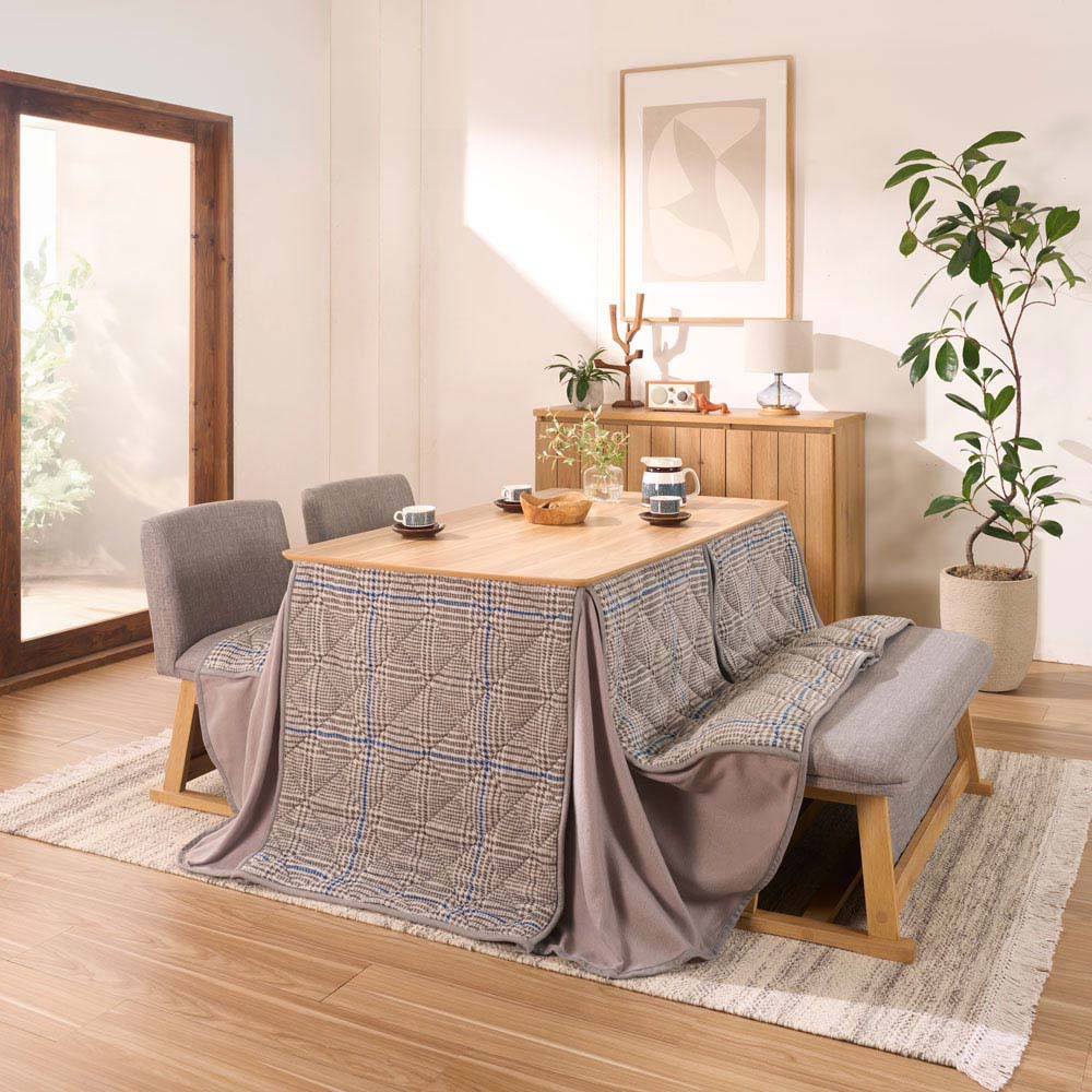 ナチュラルテイストに似合う、上品なグレンチェック柄のこたつ掛け布団です。トレンドを押さえたモダンなデザインで、すっきり使える薄掛けなのにとても暖か。体に触れる内側は、フランネル素材のなめらかな肌ざわりです。こちらは135cm×80cmのテーブル用です。