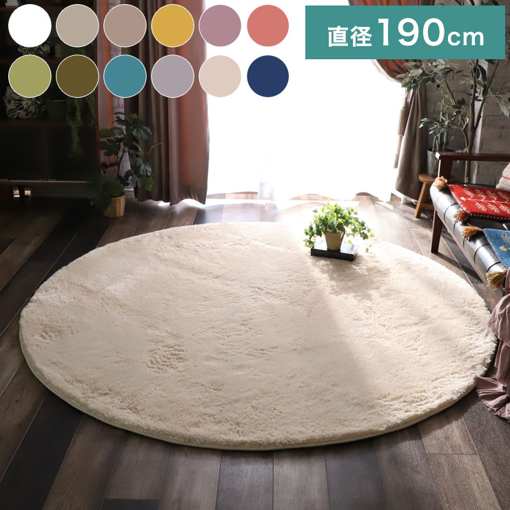 【サイズ】円形190cm【カラー】ローズイエローアイボリーベージュオリーブグリーンターコイズブルーライラックホワイトグレーグレージュ【素材】表面:ポリエステル100%中材:低反発ウレタン8mm裏面:不織布すべり止め付きPH約18mm目付400g/m2【原産国】中国強力なすべり止めを採用した、毛足18mmシャギーのシンプルリッチなベーシックラグ。厚さ約8mmの低反発ウレタンが快適さを演出。手洗いできていつでも清潔。汚れた部分を手洗いできるので、いつも清潔にお使いいただけます。耐熱加工をし、ホットカーペットや床暖房の熱に強い製品です。カバーとしてご使用になる際は、ホットカーペット・床暖房メーカーの取扱説明書に従ってください。裏面にラグが滑りにくい加工を施した製品です。