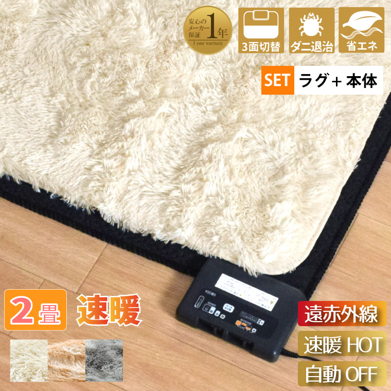 ■ホットカーペット 遠赤外線 速暖 2畳 カバー付き 2点セット 本体サイズ約176×176cm シャギーラグ(カバー:約190×190cm) 長毛 毛足35mm