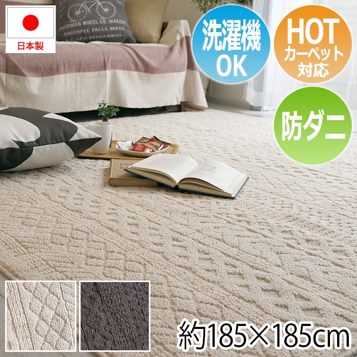※販売者情報を必ずご一読ください。国内の工場で作られたカーペットです。日本製ならではのきめの細かさをお楽しみください。安心安全♪防ダニ機能がついています。洗濯機で洗えるので、お手入れも簡単♪(必ず洗濯表示をご確認いただき、洗濯ネットをご使用下さい。)寒い冬も安心◎床暖房やホットカーペットの上でもお使いいただけます。■サイズ:約185×185cm■素材:ポリプロピレン100%■パイル長:約7mm/3mm■機能:ウォッシャブル(洗濯機洗いOK)、防ダニ、床暖房・ホットカーペット対応■その他:日本製■カラー:アイボリー、ブラウン■梱包形態:折畳み※在庫状況によっては納期に一週間程、お時間をいただく場合がございます。お急ぎの方はお問い合わせください。→約130×185cm→約185×185cm→約185×240cm
