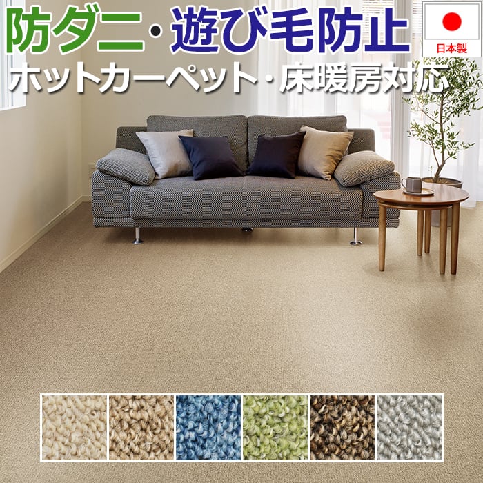 防ダニ加工、床暖対応のカーペット。 防ダニ効果は業界トップレベル。 ダニを寄せ付けず追い出す忌避効果があります。忌避率は90%以上。 約3年使用しても性能は持続し、肌に触れても安全な成分です。 ホットカーペットや床暖房の上でも使えるので1年を通して快適にご使用いただけます。 遊び毛が出にくいのでお手入れもラクラク♪ ◆サイズ:江戸間 8畳 約352×352cm ◆機能:防ダニ90、遊び毛防止、ホットカーペット・床暖房対応、ホルムアルデヒド対策品(F & star;☆☆☆) ◆組成:ポリプロピレン100% ◆毛足の長さ:約6.5mm ◆原産国:日本 ◆カラー:アイボリー、ベージュ、ブルー、グリーン、ブラウン、グレー