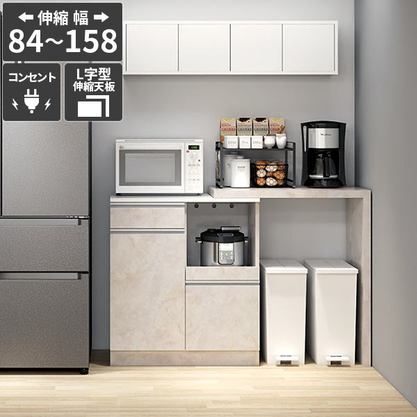 サイズ:約幅840〜1580 奥行445 高さ945 mm材質:【レンジ台】[天板・スライド棚・前板・側板]メラミン樹脂化粧合板[背板]プリント化粧合板※天板は120℃までの耐熱処理と耐水処理[取っ手]ABS樹脂【伸縮天板】メラミン樹脂化粧合板カラー:マーブル※環境によって異なって見える場合がございます。重量:約57kg耐荷重:約天板50kg/スライド棚15kg/引出し3kg/棚板5kg日本製レンジ台:完成品伸縮天板:組立品可動棚2枚(3cm間隔で14段階調節可能)背面化粧仕上げ(一部タッカー留め)コンセント2口(合計1500W)伸縮天板:床キズ防止フェルト/六角レンチ付属ブランド:arne送料無料※北海道・沖縄・離島は送料別途お見積もり。【ご注意】離島・郡部など一部配送不可地域あり。配送不可地域は通常配送便での玄関渡し。吊上げ作業等が必要な場合や建物の形態による追加料金はお客様ご負担。