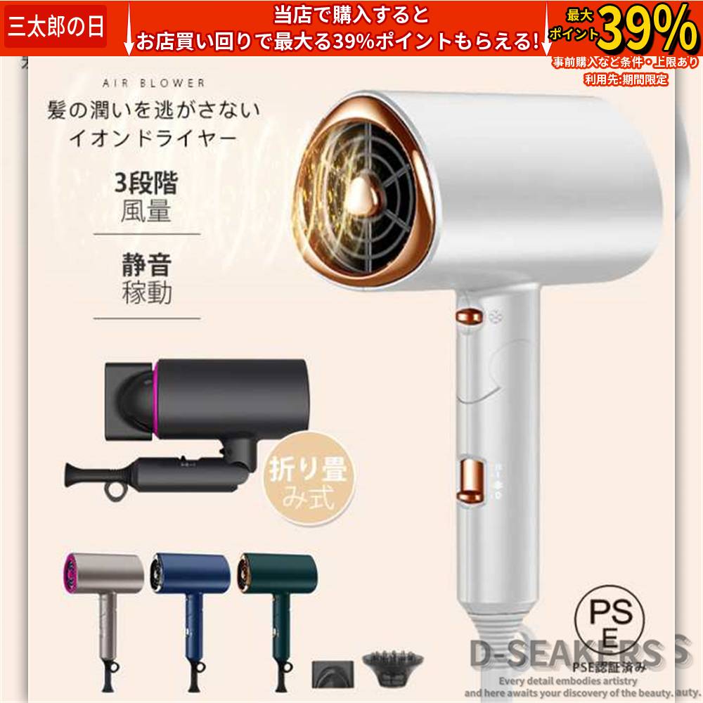 ■ヘアドライヤー 速乾 ドライヤー イオンドライヤー マイナスイオン 大風量 静音 温度調整 折り畳み式 3段階風量 美髪 熱風 温風 冷風 5カ
