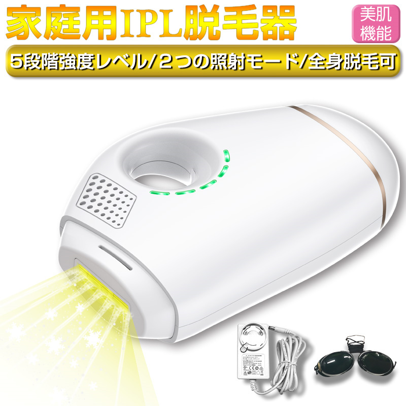 【IPLとは】IPLとは"インテンス・パルス・ライト"の略であり、キセノンランプをごく短い時間発光させた光です。フラッシュ脱毛とも呼ばれています。IPL脱毛で使われる光は、有害な紫外線がカットされており、波長の幅が広いという特徴があります。 【美肌効果】デフォルトのレベル1は美肌モードであり、デリケートな顔もやさしくお手入れできます。たった2週間で、キメ・うるおい・なめらかさ・ハリ・スベスベ感・毛穴の目立ちにくさを実感! 【5段階強度 2モード】連続モードと単発モードがあります。連続モードを使えばすばやくお手入れが可能、脚などの広い部位におすすめします。単発モードはひざひじなど細かいカーブのある部位やデリケートゾーンの使用におすすめします。照射強度は5段階に分けており、照射する部位や肌色、肌の適応性に応じて適切なレベルに調節してください。 【全身脱毛用】ボディから顔まで、1台で全身スベスベ肌へ!女性のムダ毛だけではなく、男性のヒゲにも対応します。 【パッケージ内容】脱毛器×1、日本語取扱説明書×1、保護ゴーグル×1、電源アダプター×1
